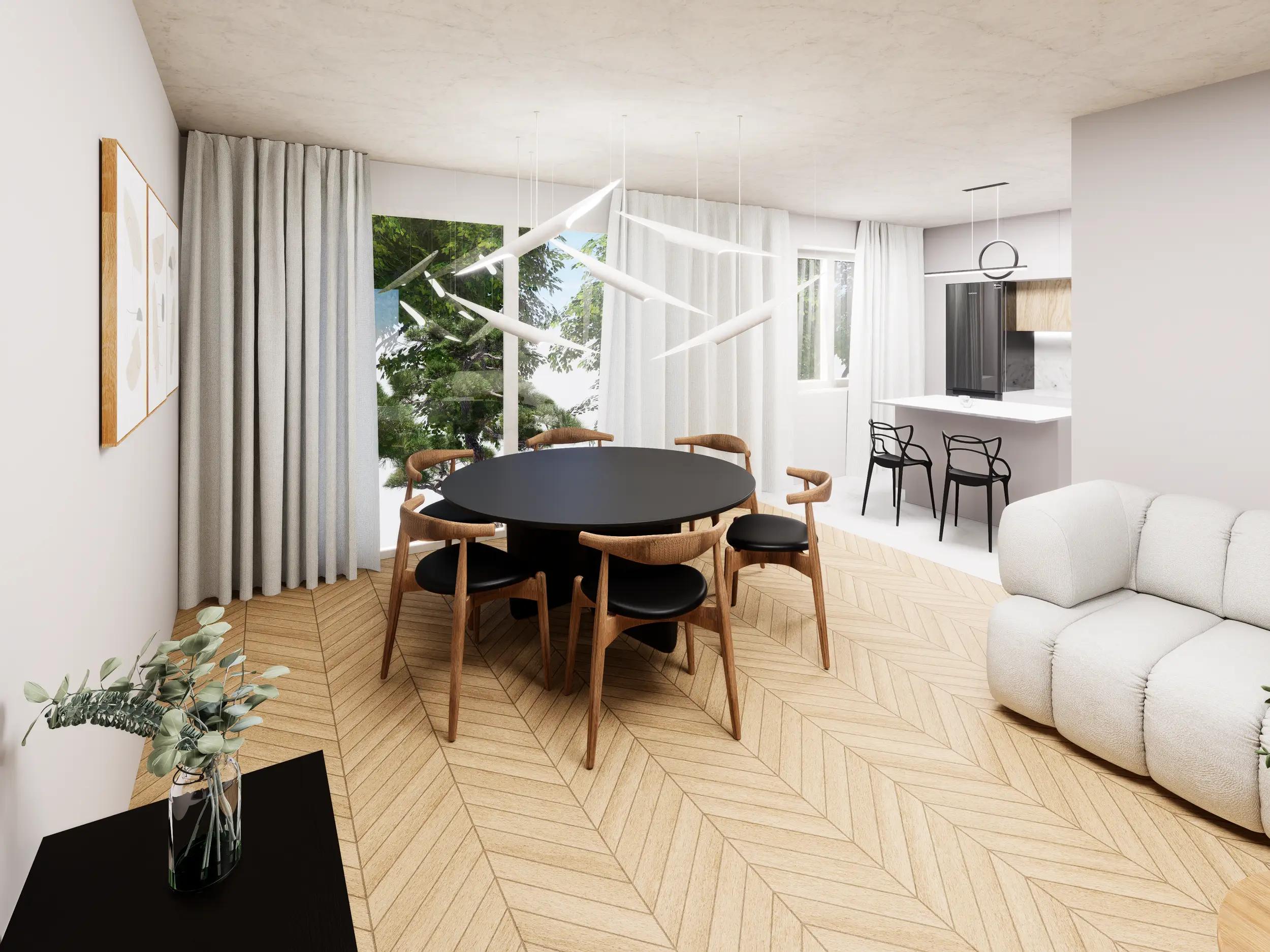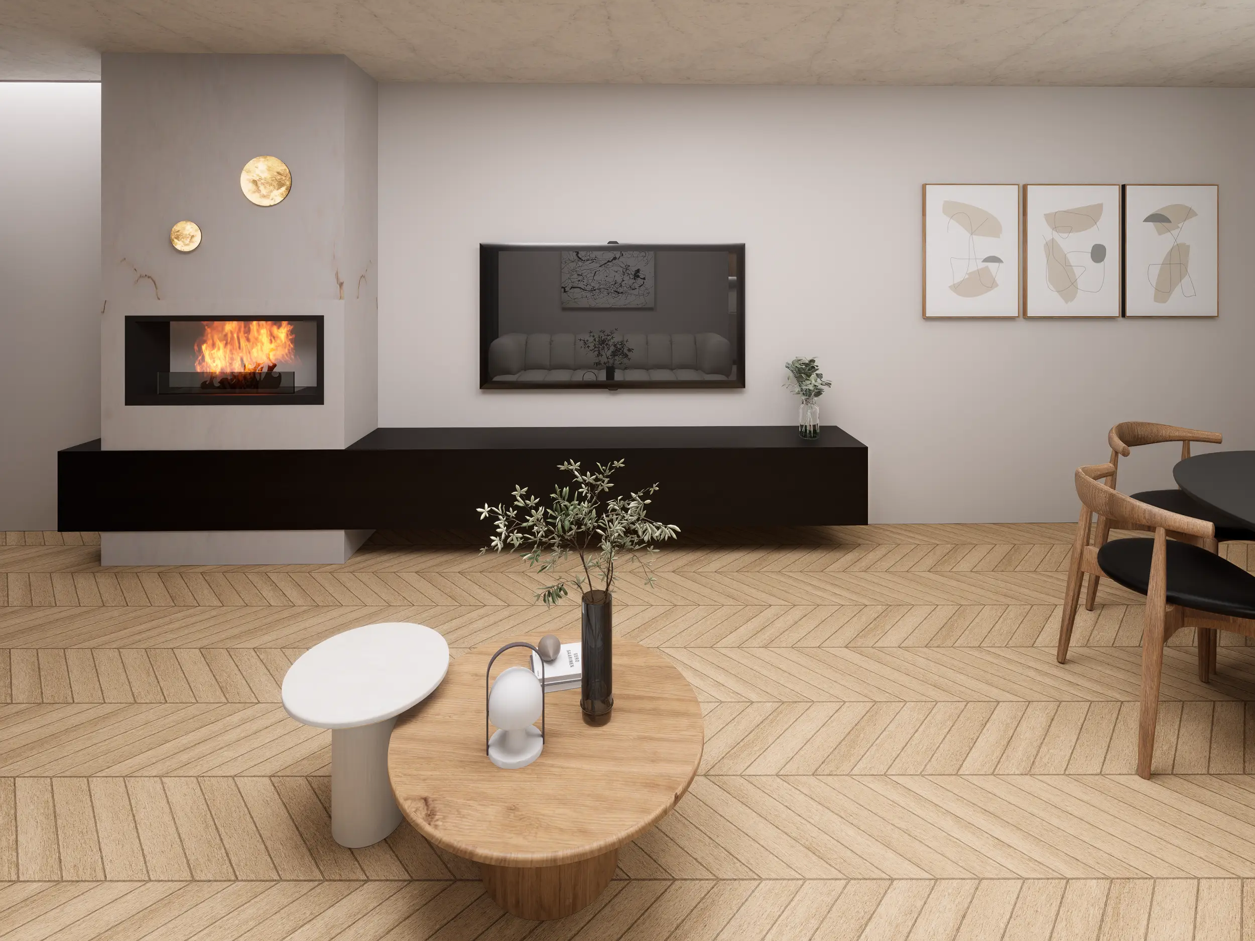 Parter tego domku szeregowego zyskał zupełnie nowe życie. Właściciele przenieśli sypialnię na piętro, a w jej miejscu powstała przytulna strefa dzienna z wymarzonym, ekologicznym kominkiem – idealna do odpoczynku po całym dniu.