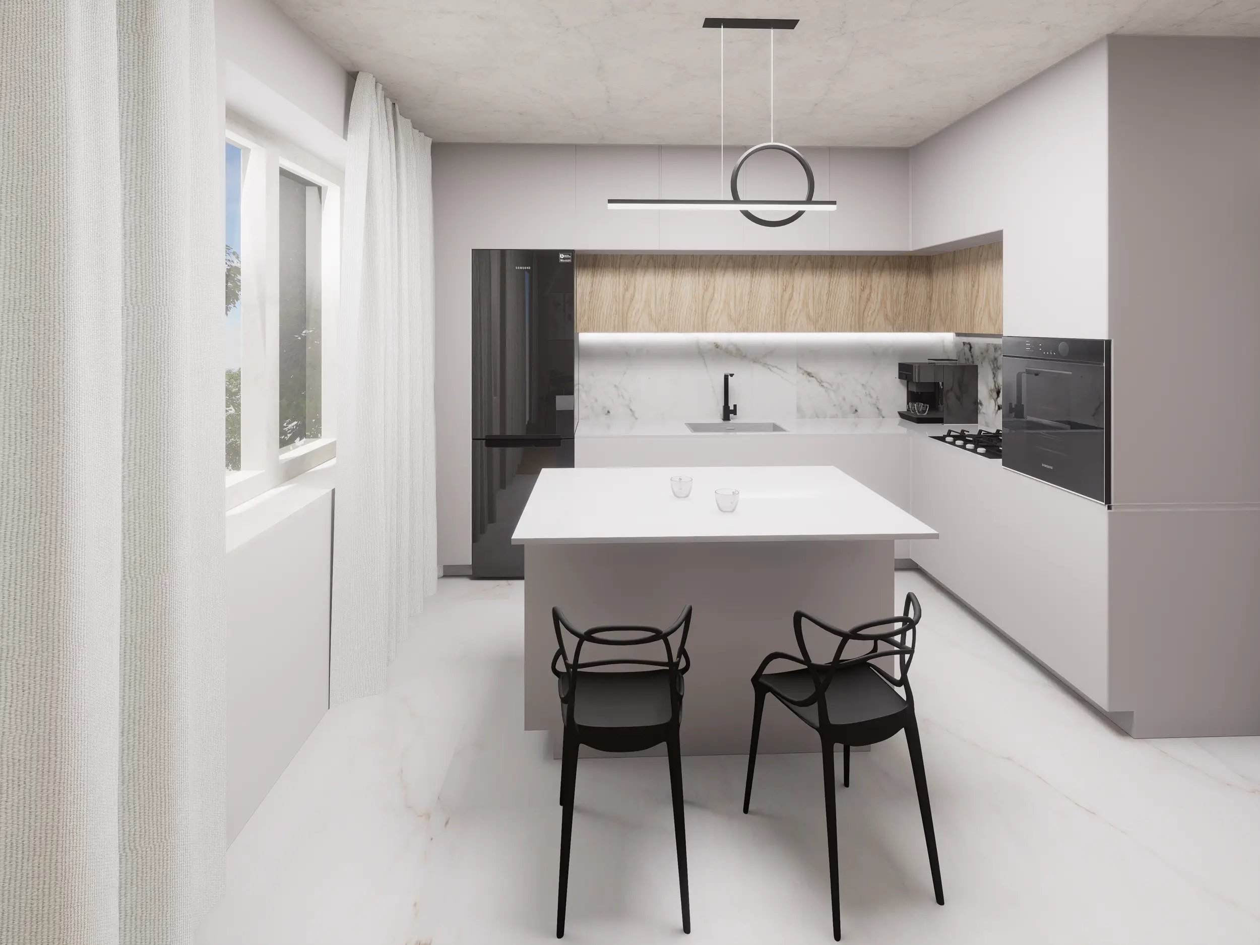 Białe blaty z konglomeratu pięknie odbijają światło, a sprytne rozwiązania w szafkach – Magic Corner, wysokie cargo i pojemne szuflady – sprawiają, że kuchnia jest jednocześnie elegancka i bardzo funkcjonalna.