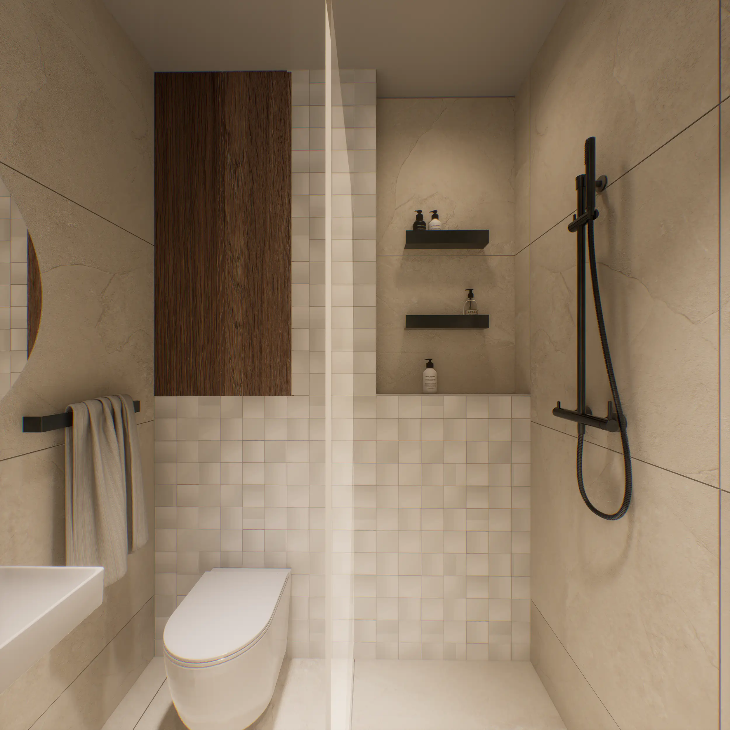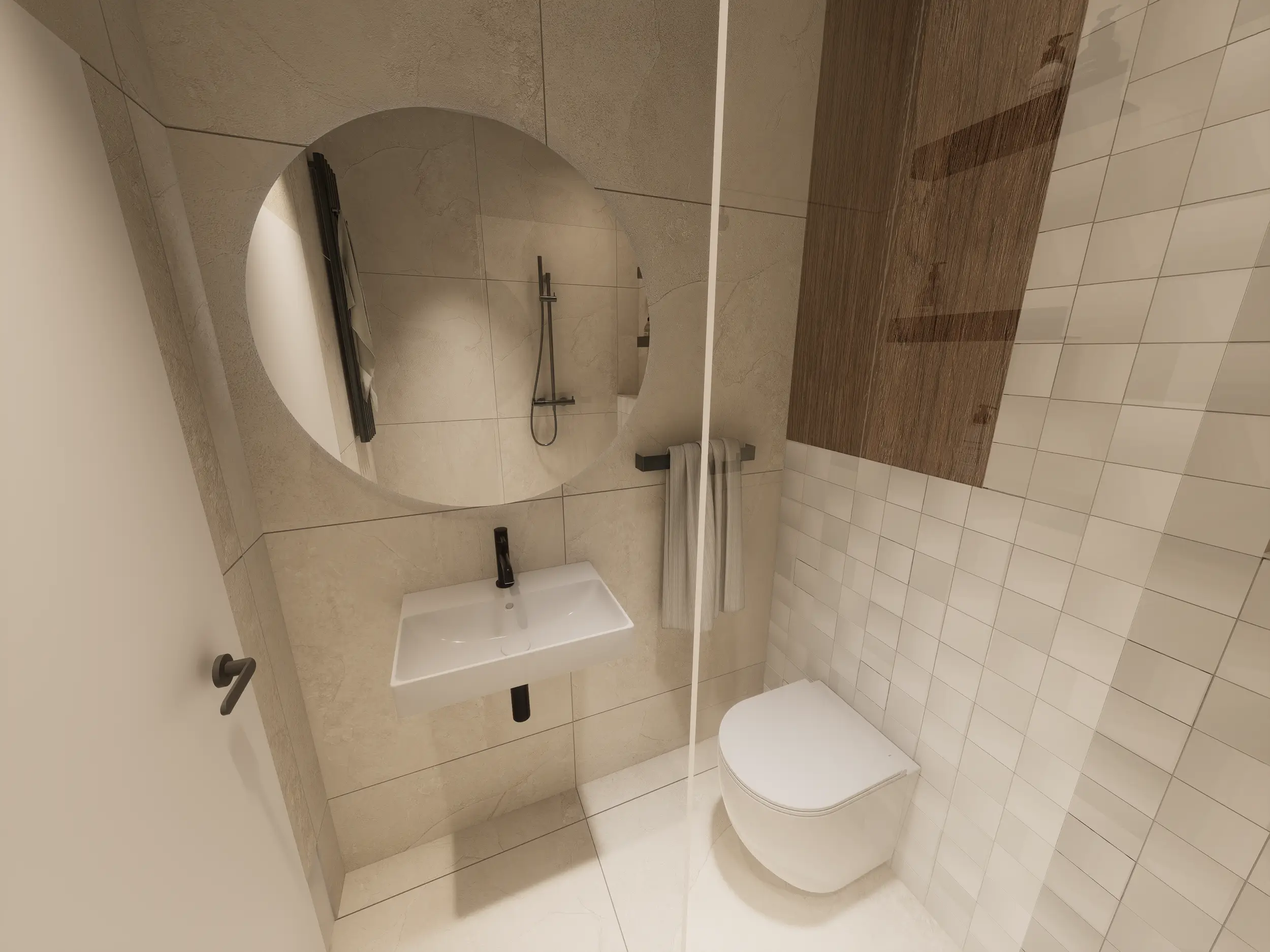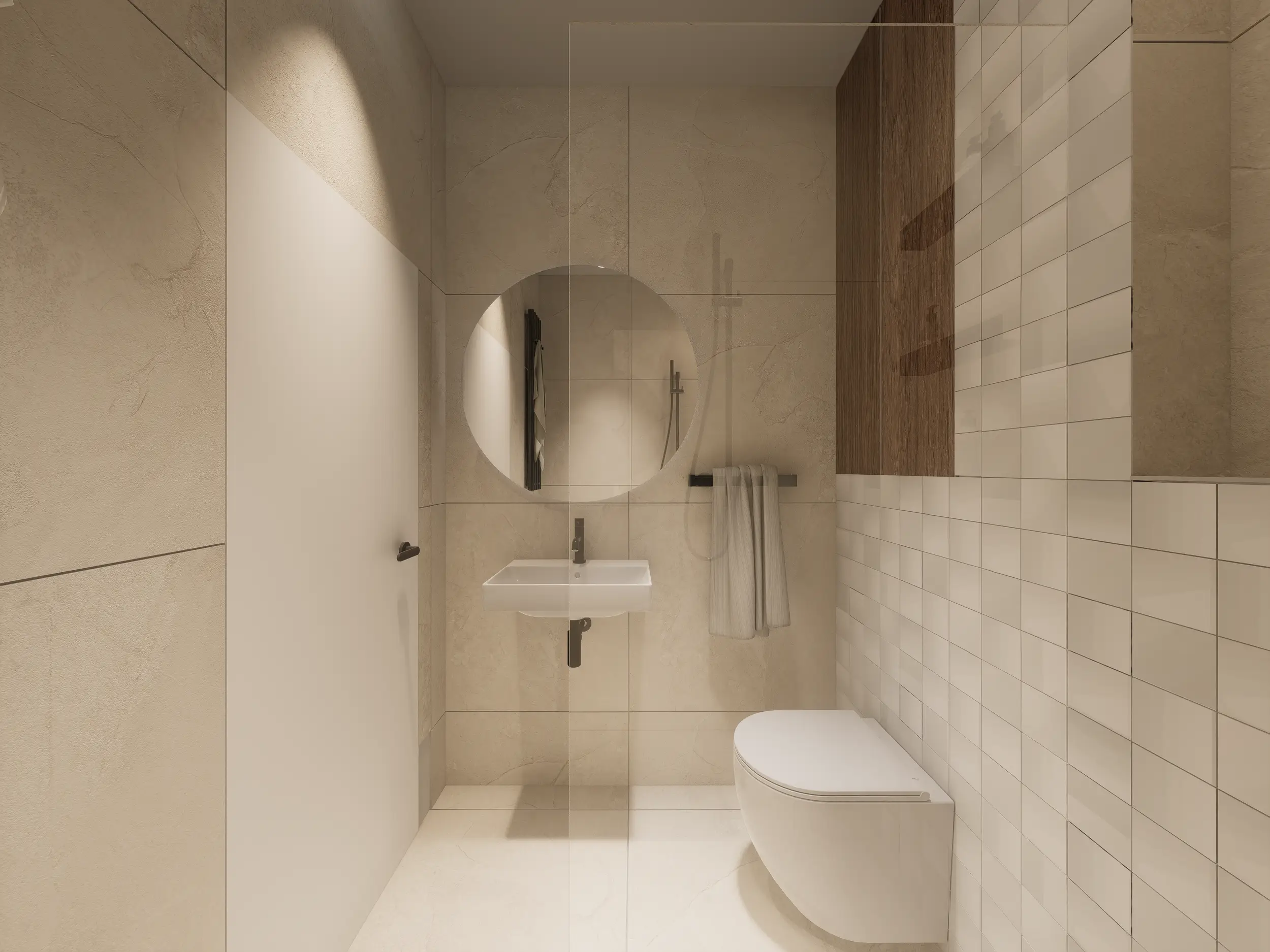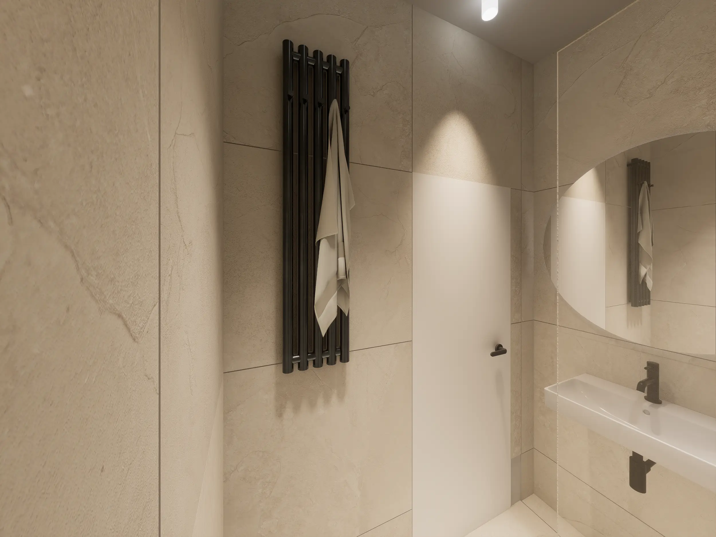 Duże lustro bez ram powiększa optycznie przestrzeń i odbija światło, a ukryte drzwi oszczędzają cenne centymetry. Duże płytki i prysznic typu walk-in dają wrażenie przestronności bez podziałów. Jasne, ciepłe beże w połączeniu z ledowym oświetleniem tworzą przytulny, relaksujący nastrój.