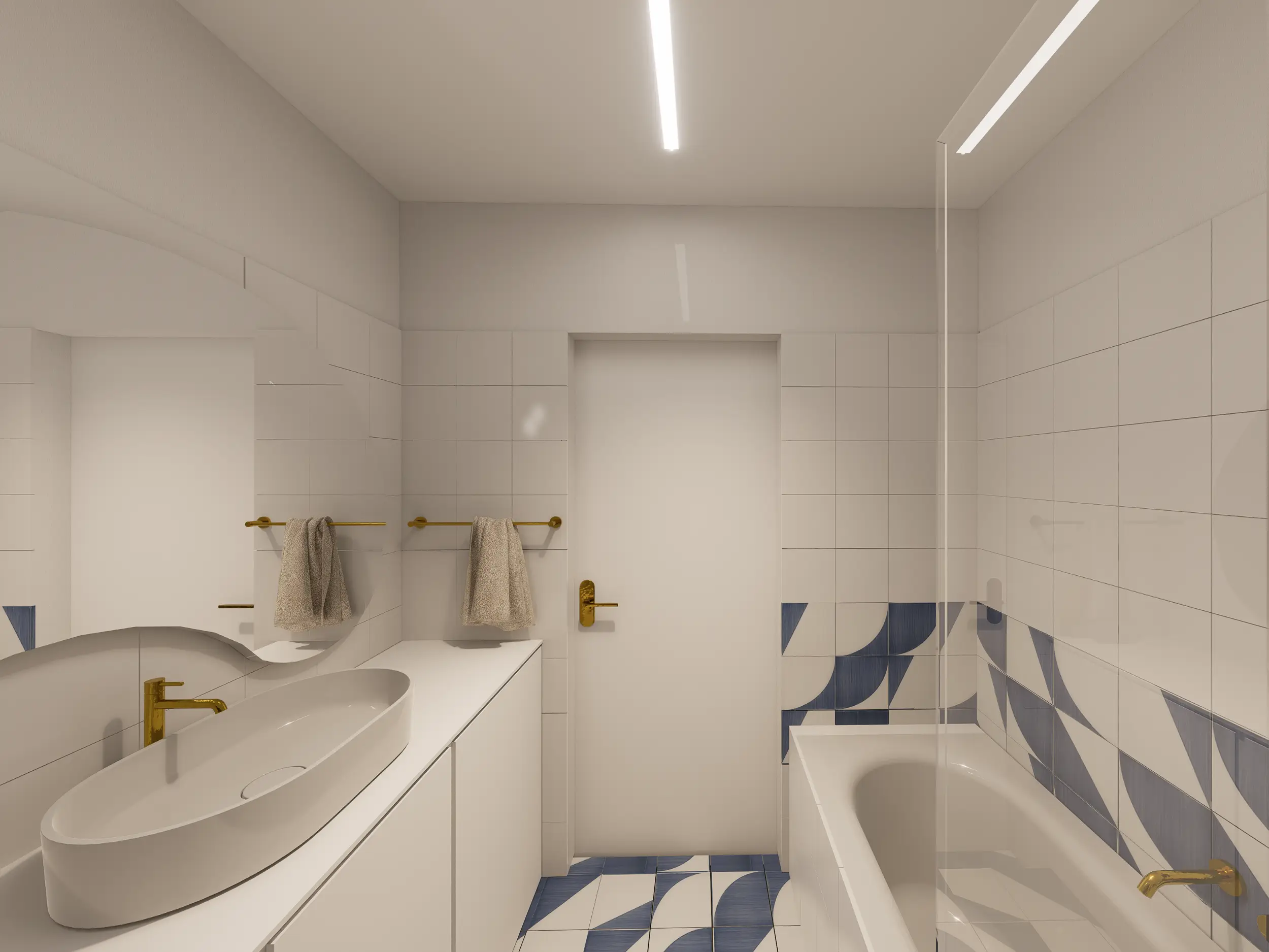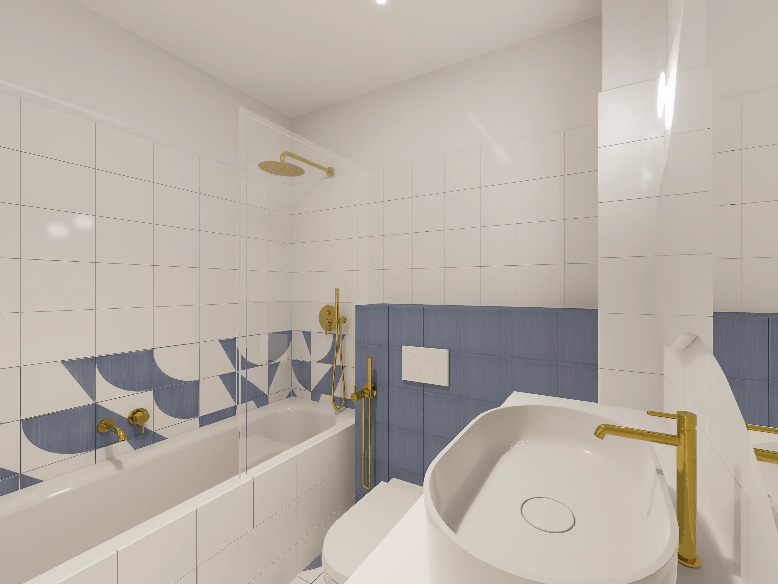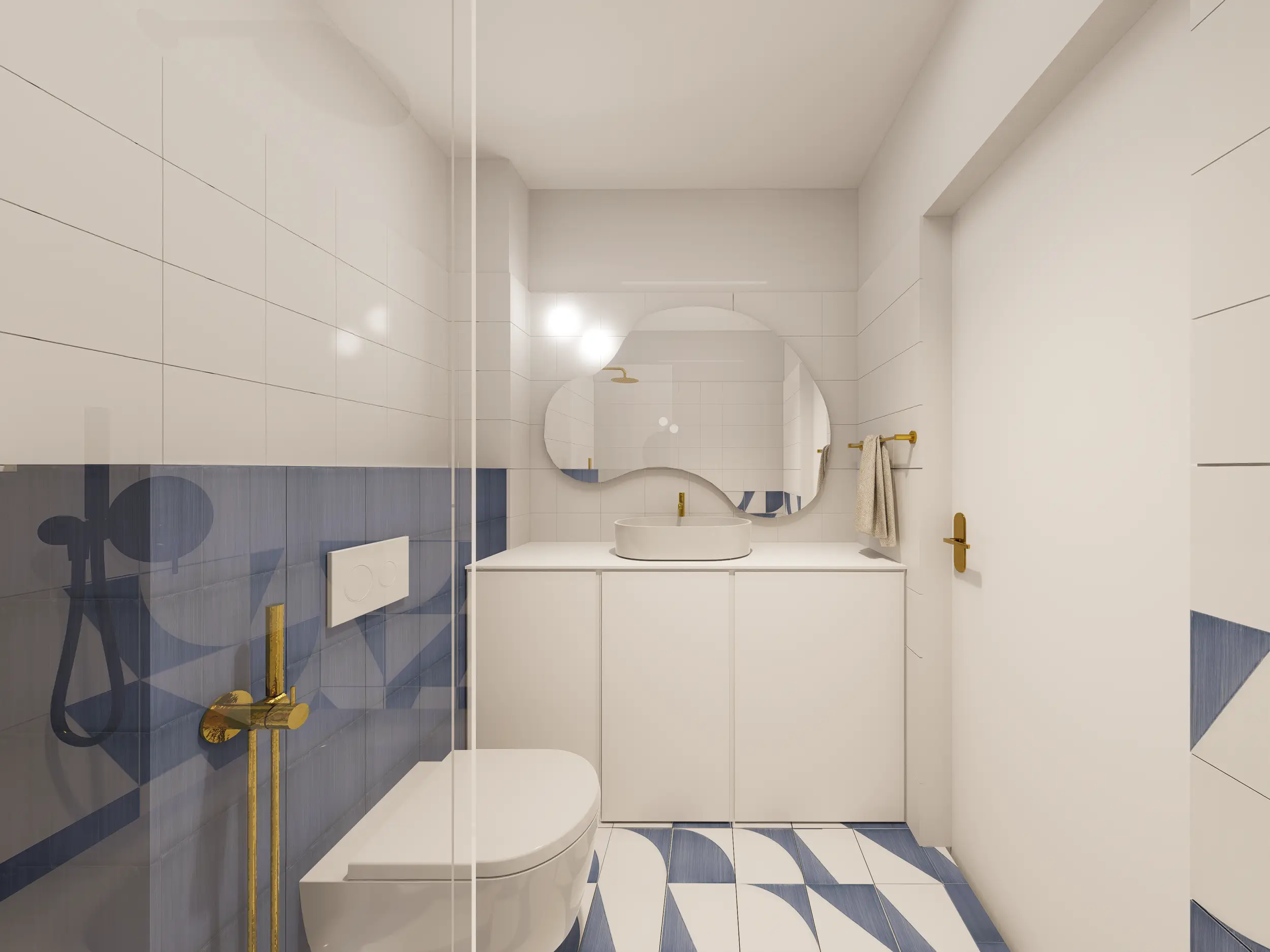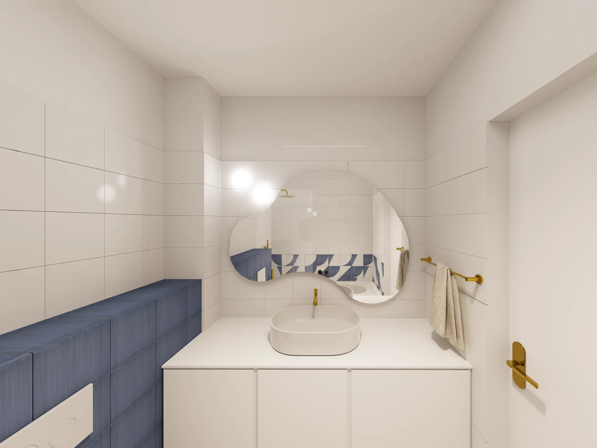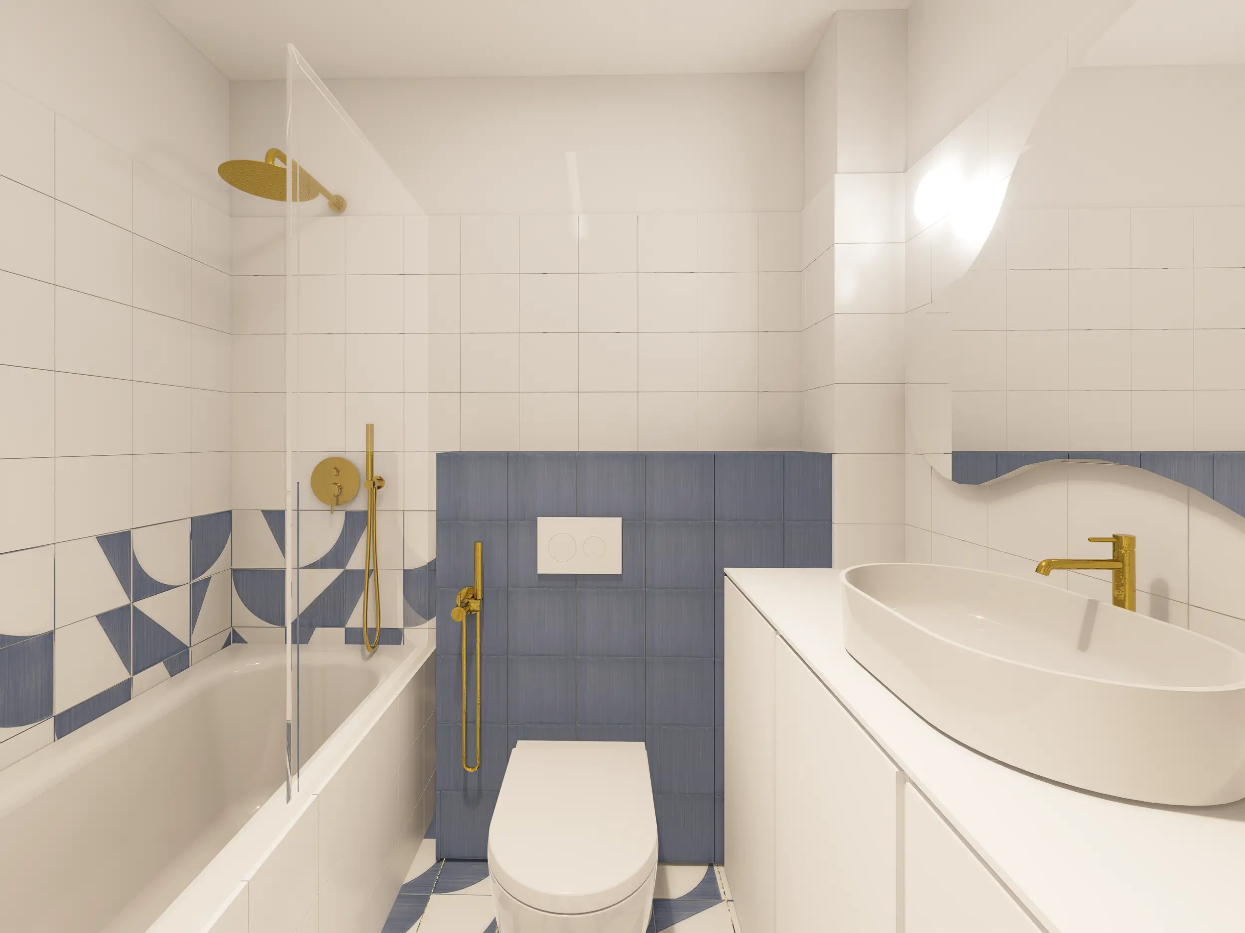 W tym projekcie powstała funkcjonalna, jasna łazienka, która łączy komfort z odrobiną błękitnego szaleństwa. Małe, ręcznie malowane płytki dodają charakteru, a przestrzeń jest przyjazna i praktyczna.