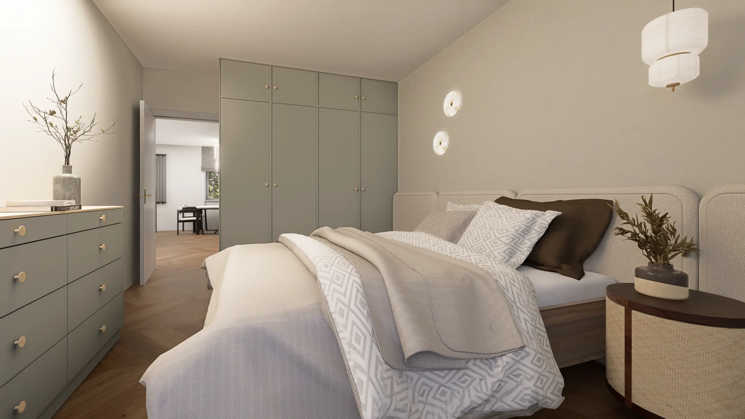Sypialnia inspirowana naturą w beżach i zieleni szałwii to prawdziwy azyl do wyciszenia i odpoczynku po dniu pełnym wrażeń.