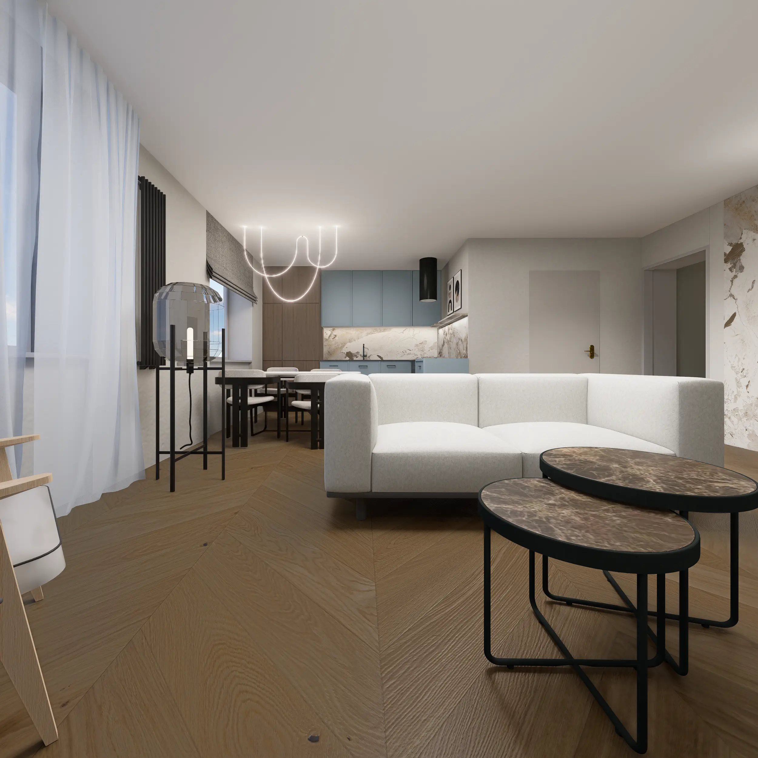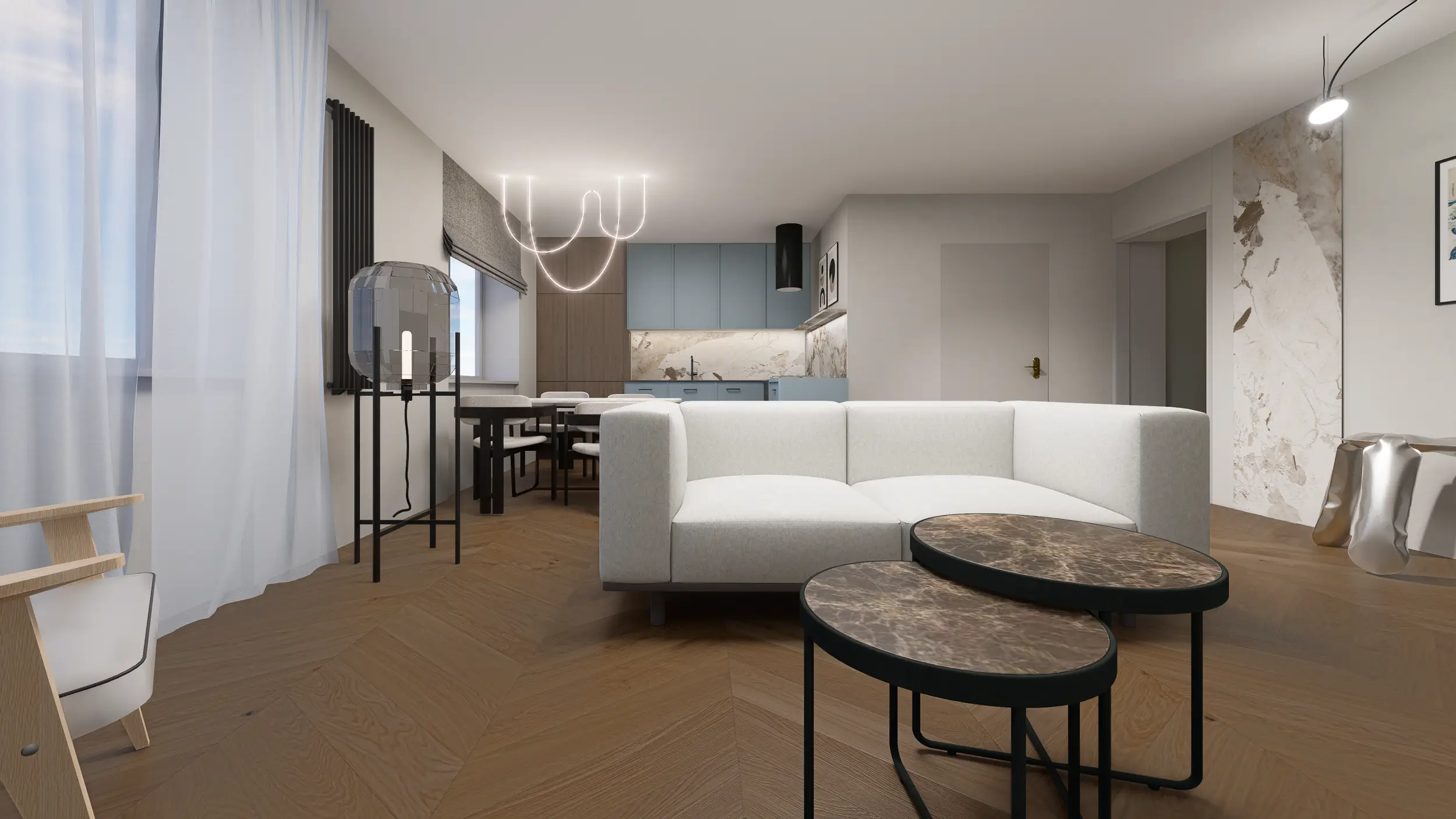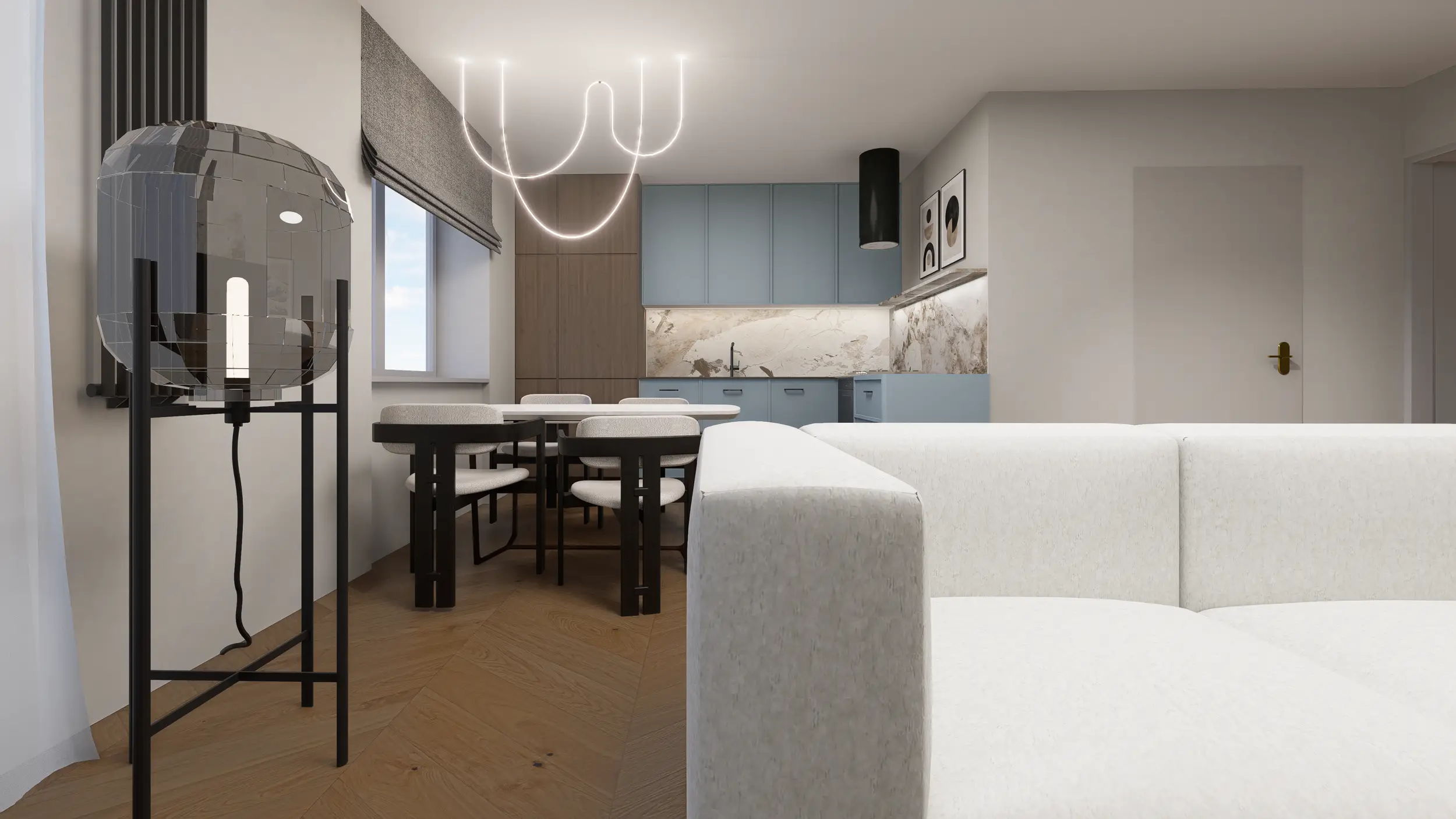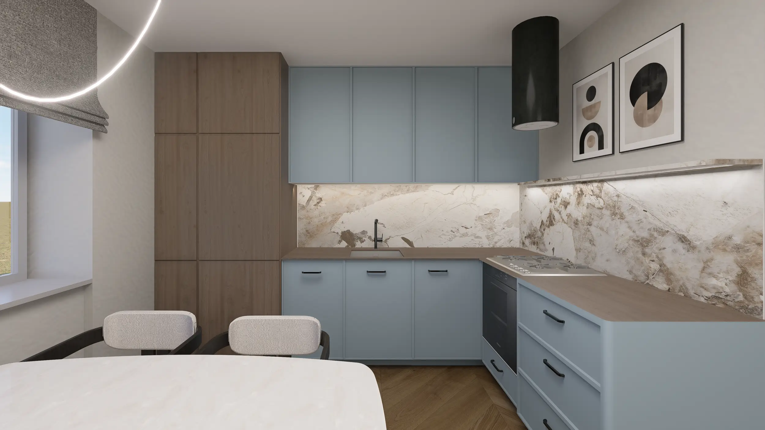 Kuchnia w gołębiu błękicie i ciepłym drewnie to miejsce na poranną kawę i wspólne chwile. Subtelne fronty, kamienny blat i naturalne faktury tworzą eleganckie, harmonijne wnętrze, w którym dobrze się żyje.
