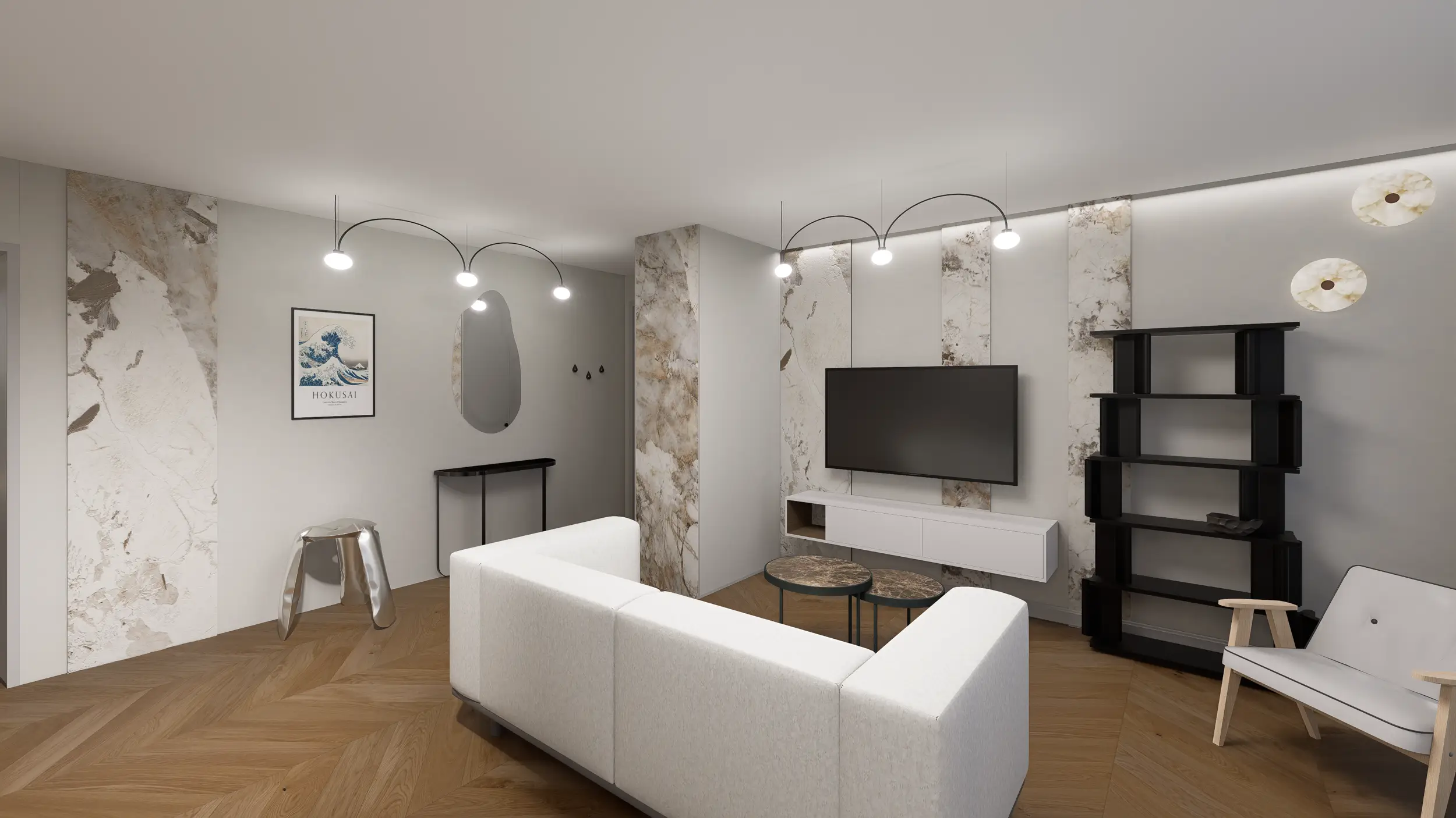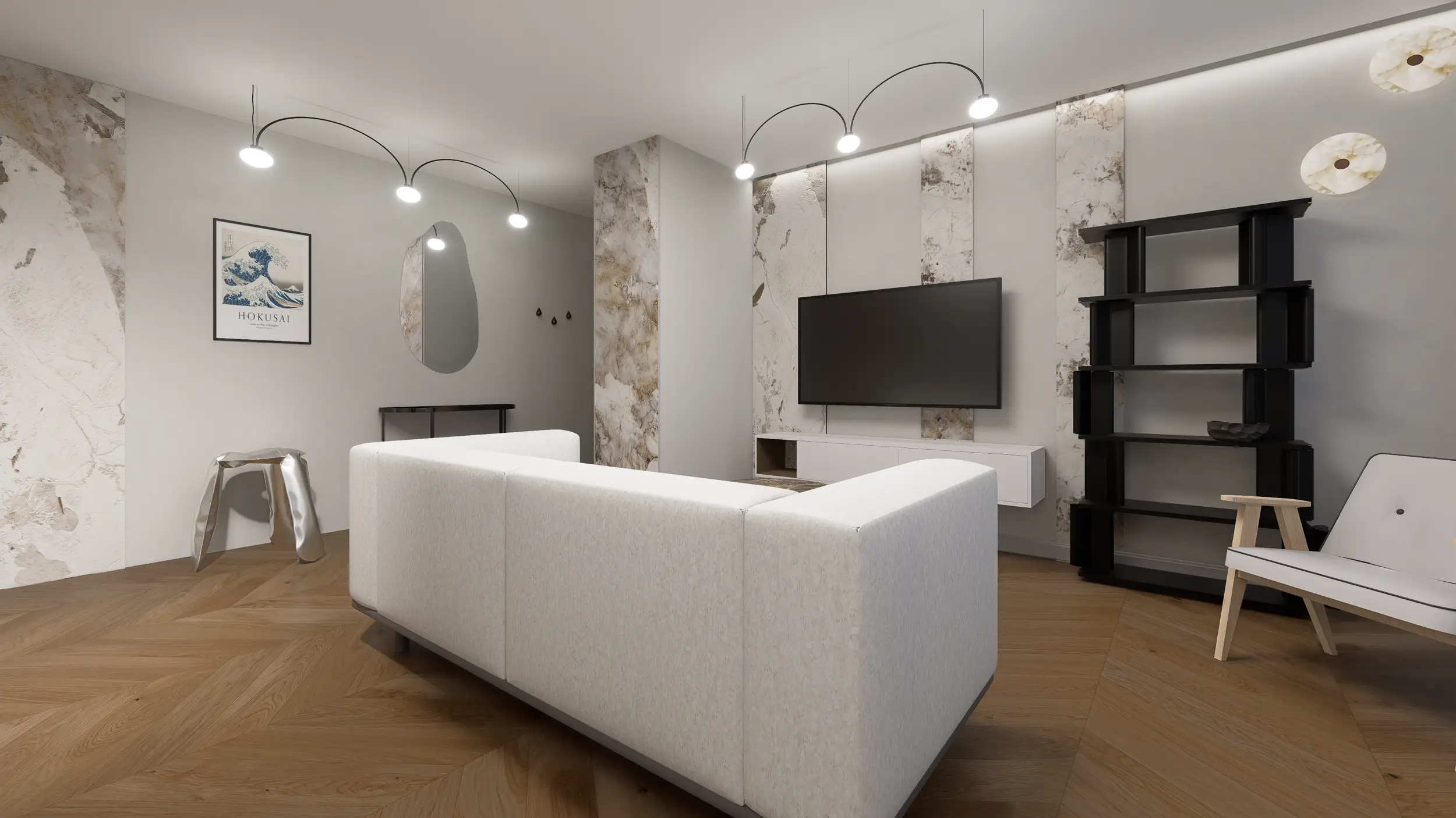 Salon łączy biel, czerń i kamień Patagonia, a nastrojowe oświetlenie wprowadza spokój i przytulność.